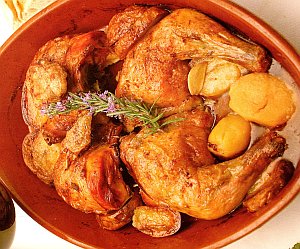 En una cazuela de barro, ponemos el pollo "espatarrat", o sea, abierto totalmente por la tripa y rompiendo el hueso del espinazo y sobre los cuartos traseros para que se abra lateralmente y se despatarre sobre la cazuela.